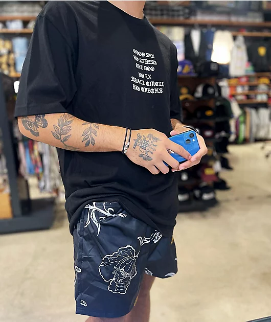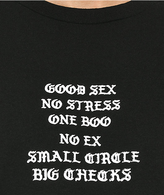 From rapper YG’s brand, 4Hunnid, comes the Fourever Good Sex V2 t-shirt in a classic black colorway and soft cotton construction. This 4Hunnid shirt has \”Good sex, no stress, on boo, no ex, small circle, big checks\” screen-printed in white on the chest an