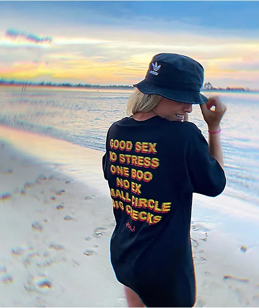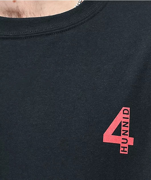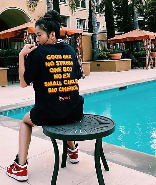 The Good Sex 4Hunnid t-shirt has a black colorway with the signature 4Hunnid on the left chest, while the back features a yellow and red, blurry text that reads, \”No stress | Big checks.\” This streetwear shirt is made from durable, breathable, midweight c