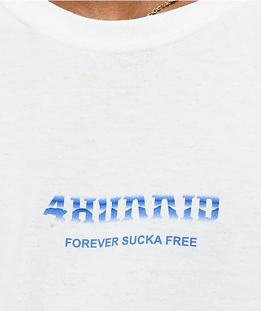 Rock your hip-hop-inspired style in bold fashion with the 4Hunnid Sucka Free white t-shirt. This all-white tee comes in a relaxed fit to maximize comfort, while the screen-printed blue logo script across the chest and upper back add classic branding and b