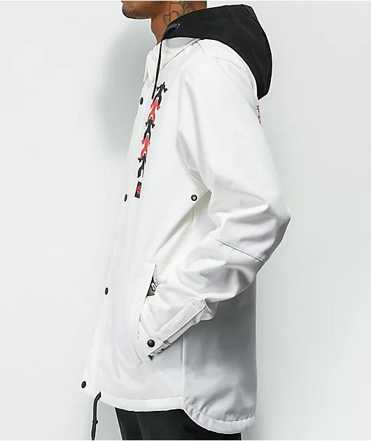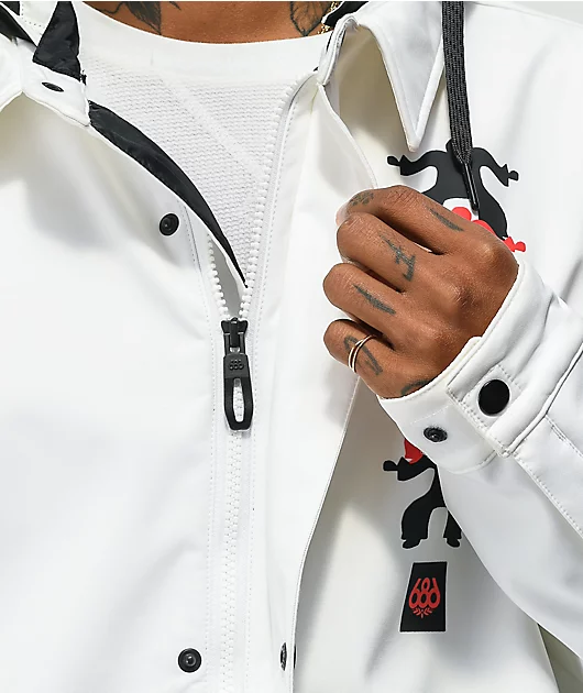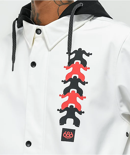 Finish off your snow style with the 686 x Forest Bailey Coaches white 10K snowboard jacket! This striking jacket features a snap-off hood, allowing for comfortable wear on blustery or clear days. A stack of black-and-red humans appears on the left chest,