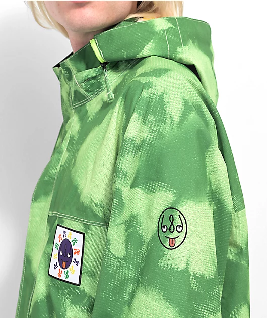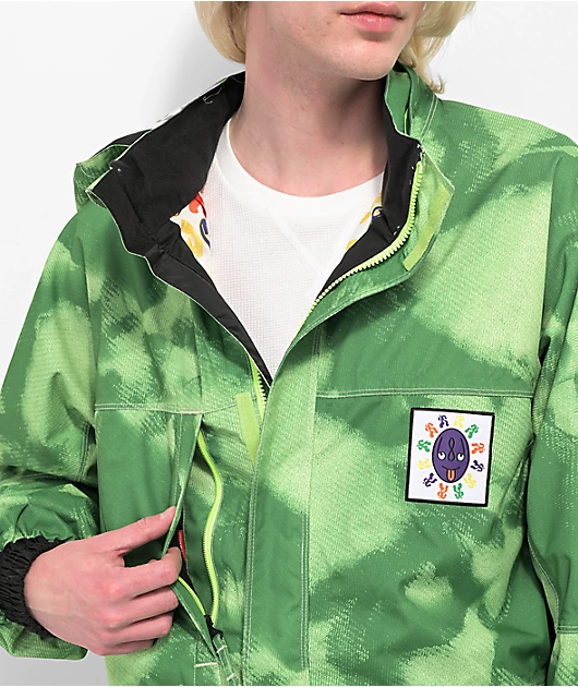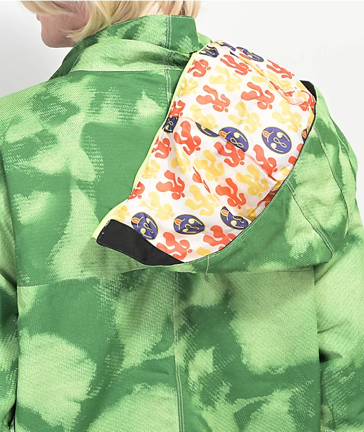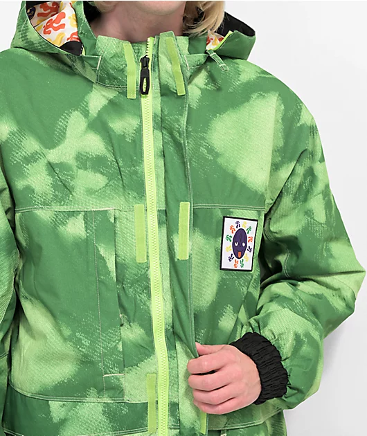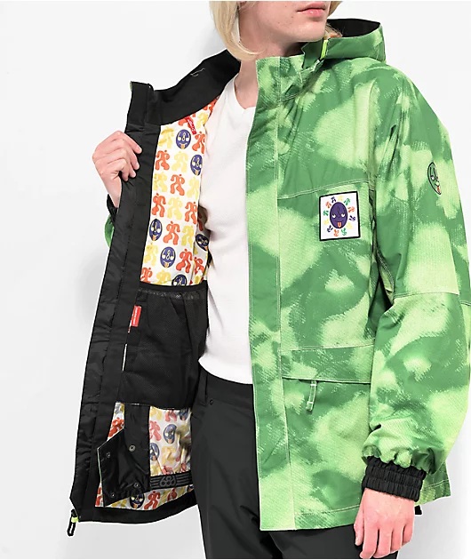 The Dojo 20K snowboard jacket from 686 comes in a worn green colorway with Forest Bailey graphics throughout the lining and adorning the shell such as the brand logo woven onto the left of chest. For the utmost comfort, this jacket has full zip closure wi