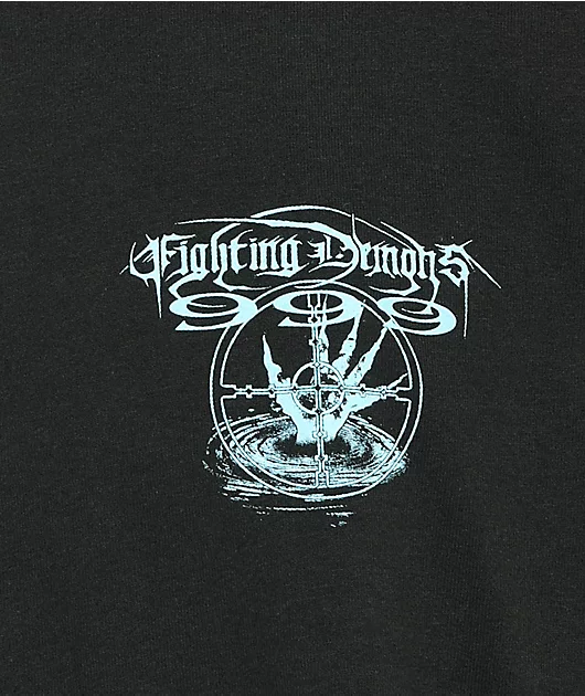 From Juice WRLD’s label 999 Club comes the Fighting Demons t-shirt in a black colorway, with light blue screen-printed graphics. A cross hair design with \”Fighting demons 999\” appears on the left chest, while the back has a graphic of the late rap icon ho