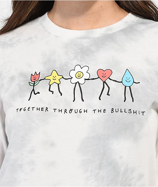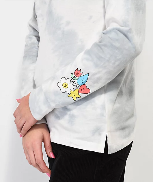 The Aby A.LAB t-shirt comes in a long sleeve construction with a grey tie dye colorway, adorned on the front with a screen-printed graphic boasting personified icons holding hands including a rose, a star, and a raindrop. Below the figures is script readi