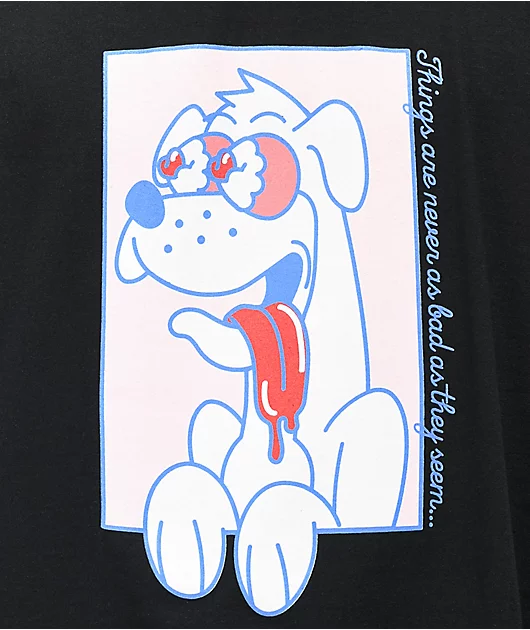 Whether you are having a good or bad day, make sure to wear the Always Worse black t-shirt from A-Lab. This black tee features screen-printed graphics at the chest and back of a stoned dog with red cupcake eyes, along with text that reads \”Things are neve