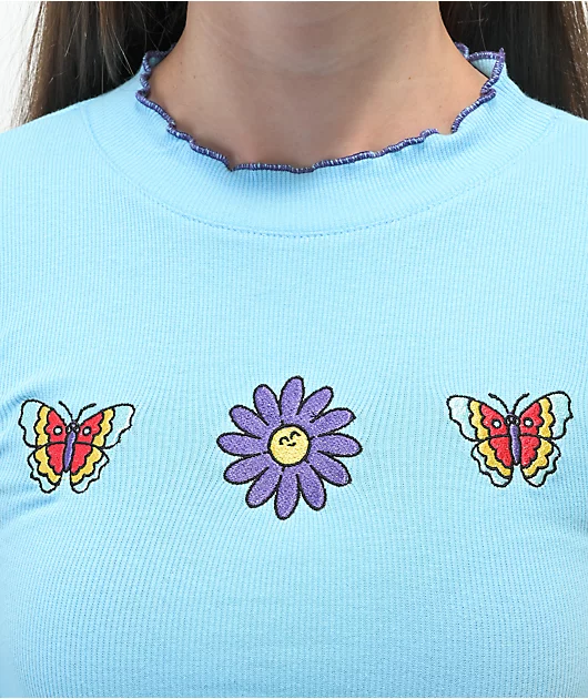 Sprinkle some nostalgia into your look with A.LAB’s amber blue long sleeve crop t-shirt! This slim-fit, ribbed knit shirt has a ruffled hemline from mock turtleneck to waist, giving this casual tee a little extra flair, while the embroidered butterfly and