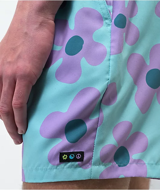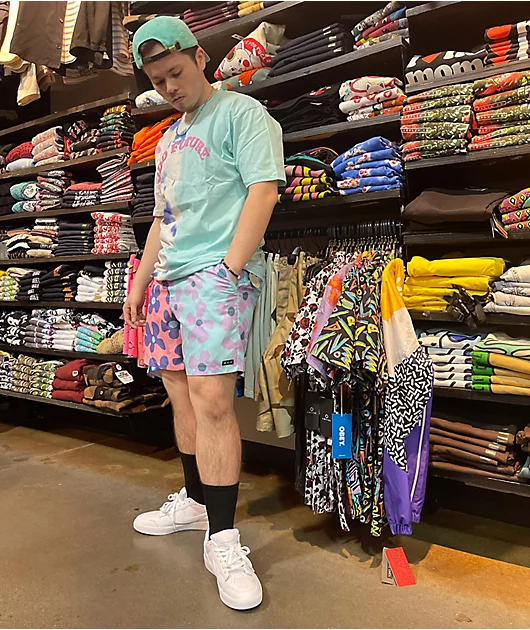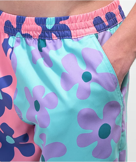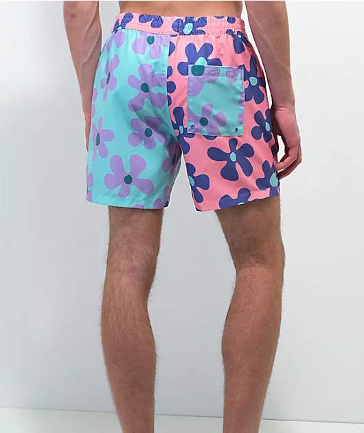 The Bum board shorts from A.LAB are made of 100% recycled polyester and come in a split pink and blue colorway with purple accenting graphics of a flower. Along with an unlined interior for unrestricted movement, the pink, ribbed waistband features a draw
