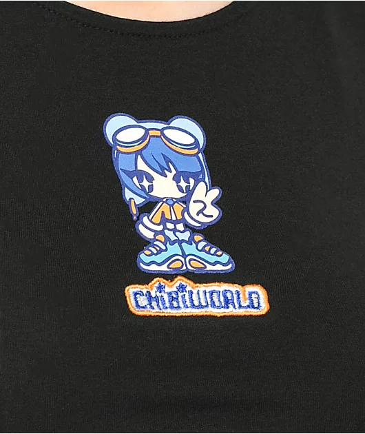 The Darbie Chibi World tank top comes in a black colorway with a tight, cropped silhouette and a cutout along the right side. A screen-printed graphic of a chibi-style character is situated on the chest, while orange and blue embroidery reading \”Chibiworl