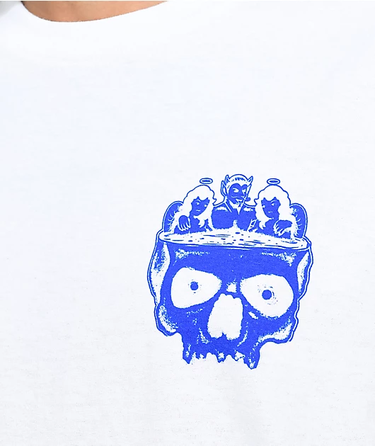 Let your true color fly with the Devil’s Playpen white t-shirt from A-Lab. This pure cotton design features a blue graphic at the left chest of the devil relaxing in a skull pool with two angel babes that is repeated larger on the back with \”Devil’s Play