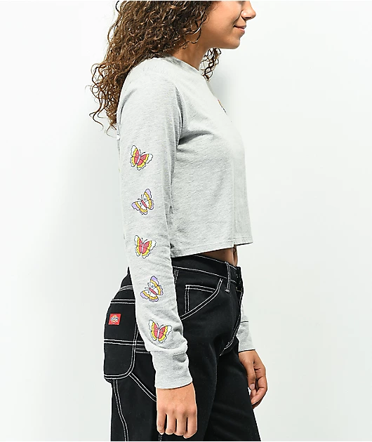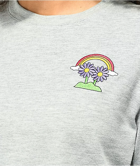 Add some colorful, peaceful vibes to you outfit with the Dita Rainbow grey crop long sleeve t-shirt from A.LAB! This cropped long sleeve shirt is adorned with a screen-printed graphic of mushrooms, flowers, and butterflies living in harmony under a happy