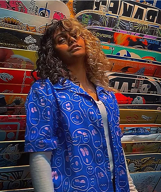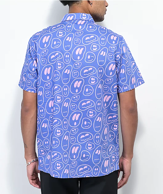This super soft, woven button down from A-Lab is made from lightweight, breathable cotton, and has a boxy, flowy fit. The Face Off A-Lab short sleeve button up has a purple colorway with sublimated pink faces throughout. This button up has a left chest po