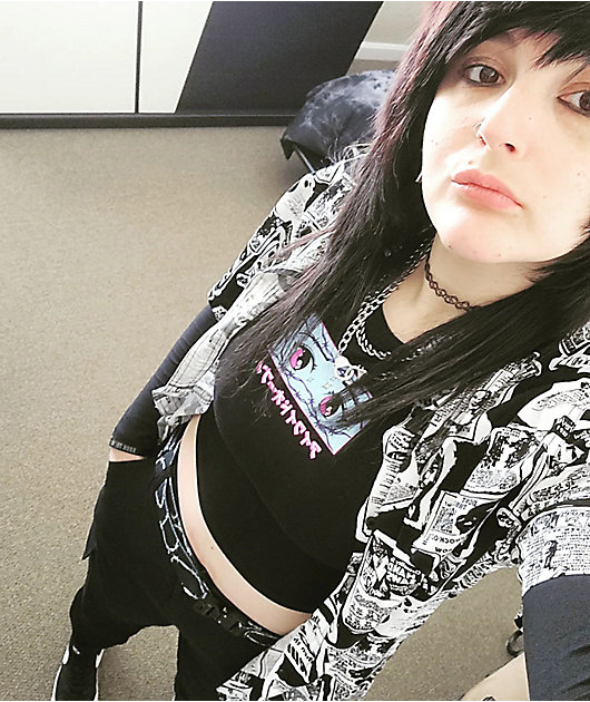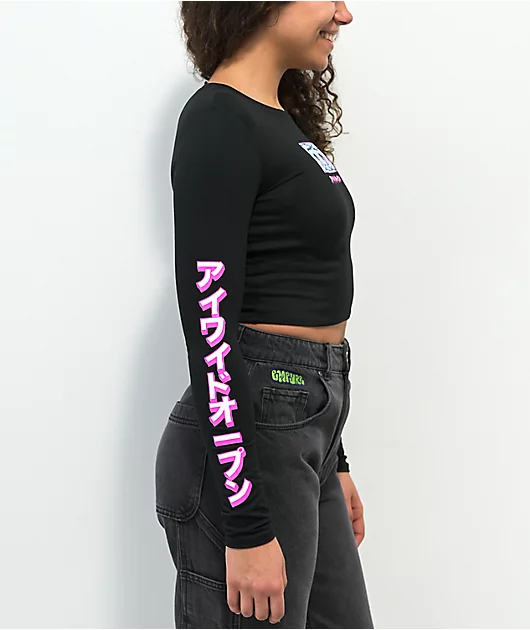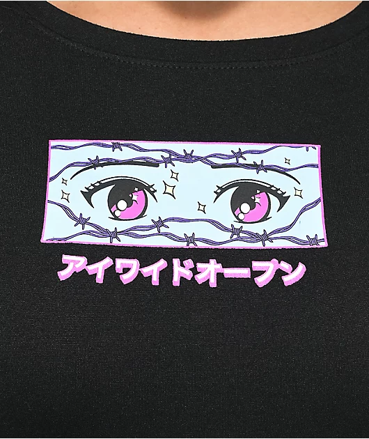 The Freckle Anime Eyes crop long sleeve shirt from A.LAB comes in a black colorway and features an intriguing screen-printed graphic of an anime character’s eyes across the chest along with purple and blue script down the right sleeve.