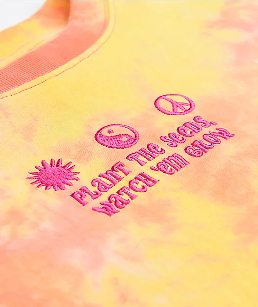 Blend some blossoming style into your closet with the Gayle orange tie dye crop long sleeve t-shirt from A.LAB! The cropped hemline and long sleeves add a casual twist to the top, while the orange, yellow, and pink hues swirled throughout the shirt lend i