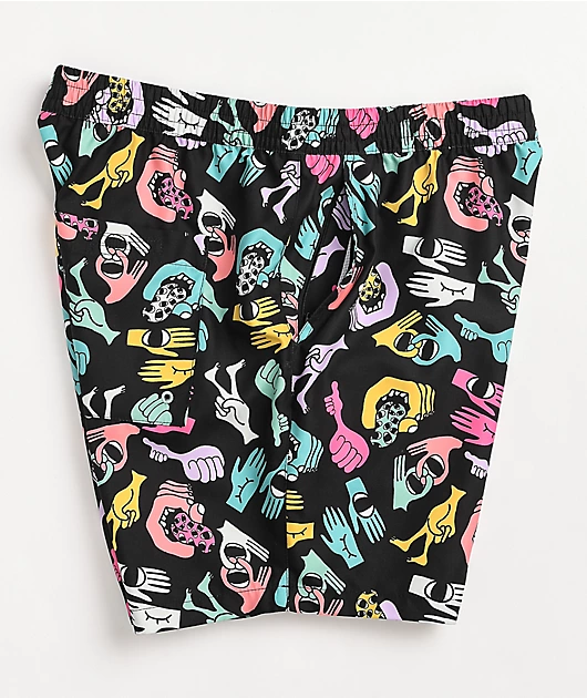 Dip your toes into some dope poolside style with the Hands Print black board shorts from A-Lab! The elastic waistband and relaxed fit keep these swim trunks super cozy, while the print throughout featuring various pastel-hued hands doing things hands don’