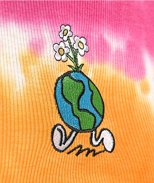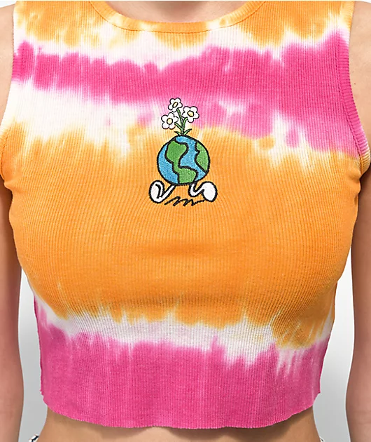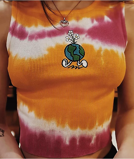 The Honey World A.LAB crop tank top has a unique orange, white, and pink tie dye treatment and a small Earth with legs embroidered on the chest. This A.LAB cropped top has a ribbed construction, scoop neckline, and wide, fixed shoulder straps. It’s also m