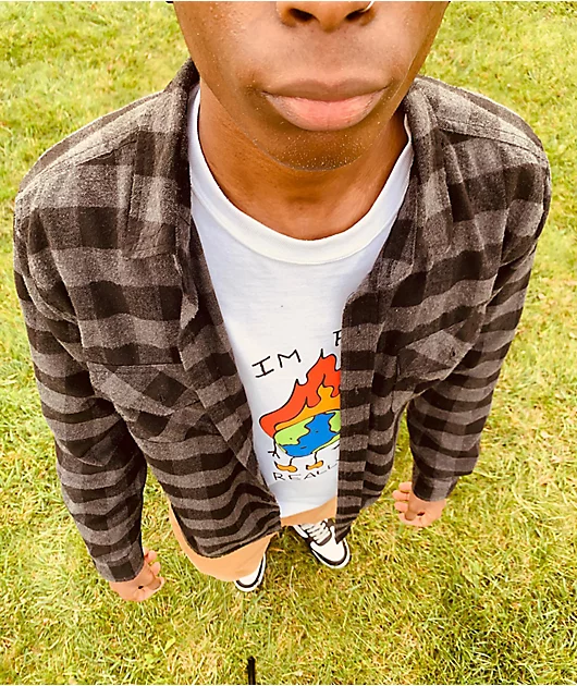 Comiserate about the state of the world in the I’m Fine World white long sleeve t-shirt from A-Lab. \”I’m fine, really\” appears across the chest, along with a sad globe who’s up in flames, wishing it could just go back to the old days.