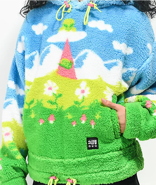 Add a serene scene to your outerwear collection with the A-Lab Kadley Trippy Landscape blue and green crop Sherpa hoodie from A-Lab! A striking landscape is depicted across the chest of this fuzzy fleece hoodie, with an alien in the distance being sucked