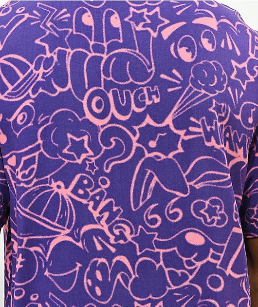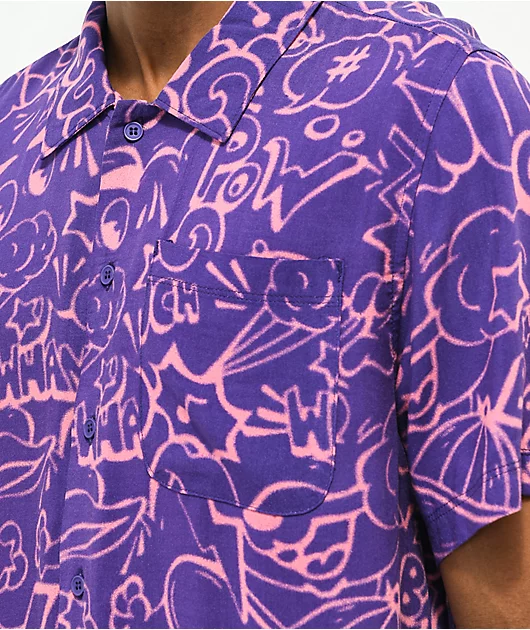 The A-Lab Knock Out short sleeve button up has a navy colorway is enveloped in pink sublimated graphics of comic-style thought bubbles and \”Ouch,\” \”Pow,\” and \”Wham!\” script. It has a boxy, relaxed fit and is made completely from rayon, lending it a lightw