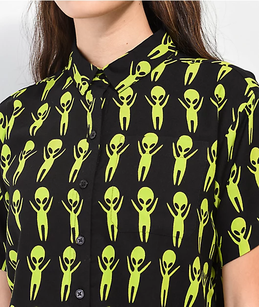 A.LAB Kona Black & Green Crop Short Sleeve Button Up Alien Shirt