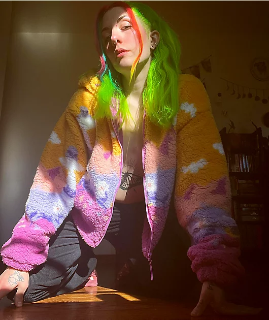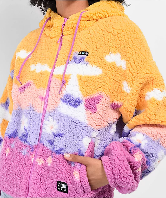 The Lydia Landscape zip hoodie from A-Lab comes in a colorful pink, purple, and yellow construction with a sublimated graphic of a ufo hovering over a mountain range throughout. A small brand patch is embroidered onto the left of chest and above the botto