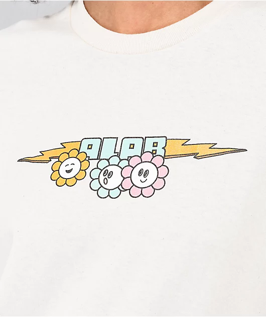 The Making Memories A-Lab t-shirt comes in a natural colorway with the brand name screen-printed on the front along with three flowers and lightning bolts. On the back is a larger graphic of a skull with sun rays extending out flowers, globes, and more as