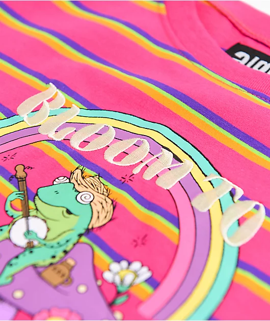 The Quinnie Bloom Tune t-shirt from A.LAB comes in a crop construction with a pink colorway, adorned with purple, green, and orange stripes throughout. On the front is a screen-printed graphic of a frog playing the banjo under a rainbow, with embroidered