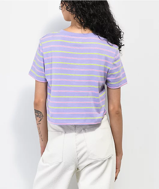 Don’t be afraid to tell people how you really feel with the Quinnie purple striped tee from A.LAB. This shirt comes in a pastel purple colorway with green and pink horizontal stripes, and features a graphic of a lil’ flower guy skating across the front,