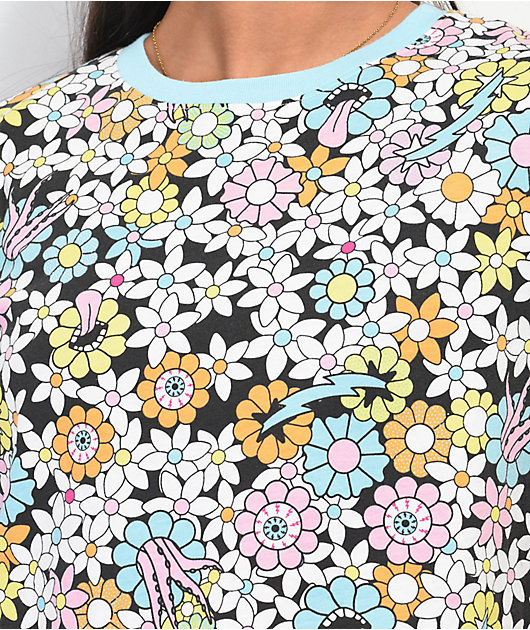 The Quinnie Trippy Floral t-shirt from A.LAB features a colorful floral print deign, with playful accents throughout. Pink, orange and yellow hues are sublimated throughout the cropped silhouette, as the tee is finished with a contrasting light blue neckl
