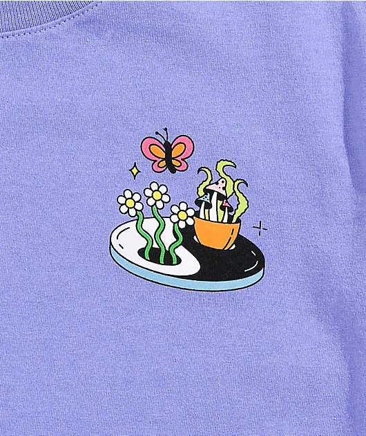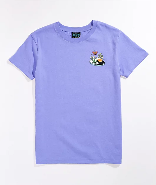 Turn the cartoon knob up on your wardrobe with the A.LAB Rainen Planters lavender t-shirt! The back of this t-shirt sports illustrations of a cactus, yin yang, butterfly, flowers, and more, contrasting perfectly against the striking lavender colorway.