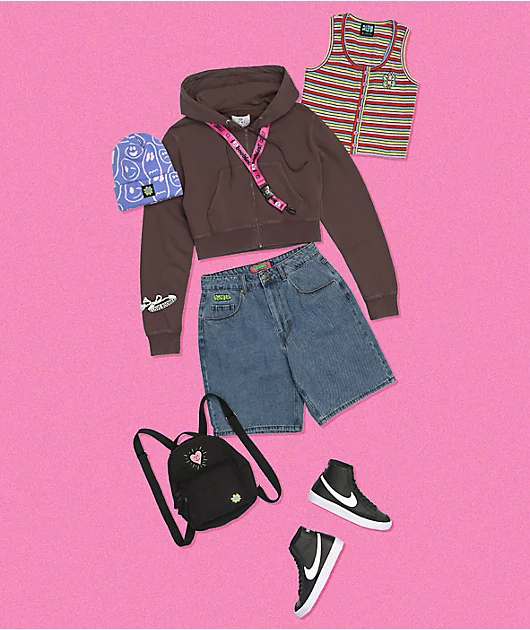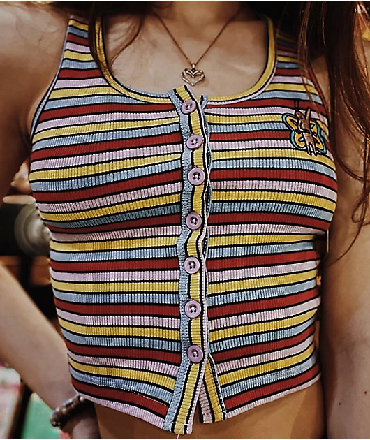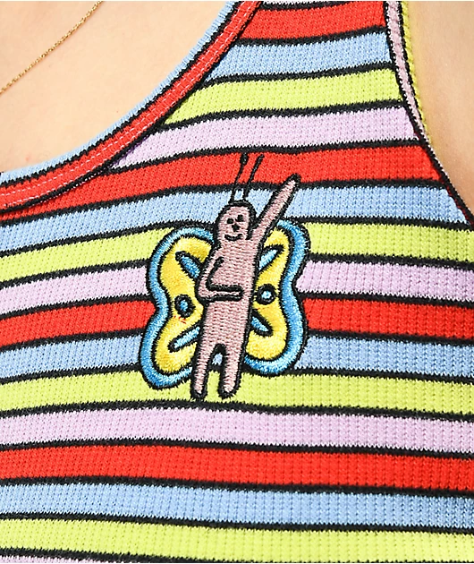 The Roscoe button up crop tank top from A.LAB has a horizontal, multi-stripe design of blue, red, green, and purple, with an embroidered waving butterfly on the left of the chest. This tank top is fabricated from soft and breathable cotton, with added spa