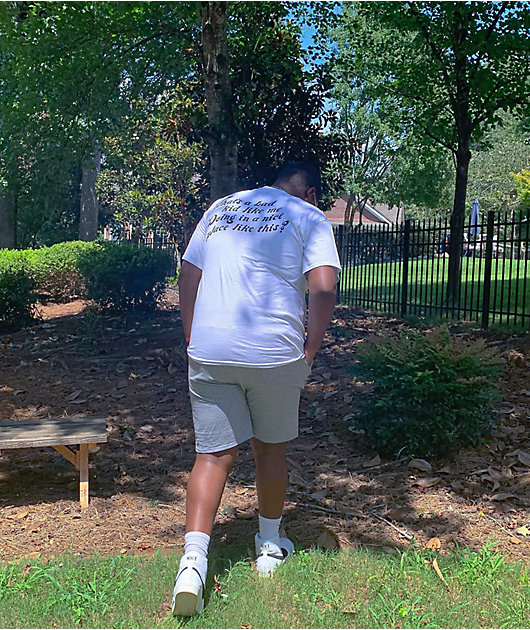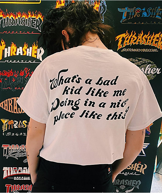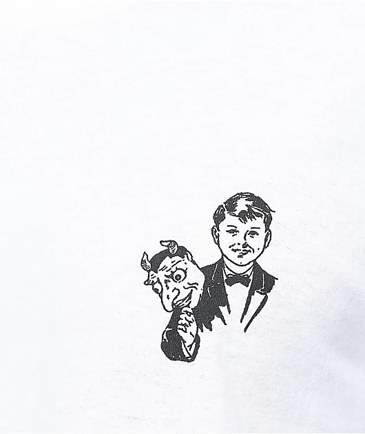 The Schemin’ t-shirt from A.LAB comes in a white colorway with a front left screen print featuring a young man pulling a devil’s mask away from his face. On the back is a connected graphic with text reading, \”what’s a bad kid like me doing in a nice place