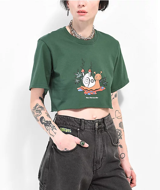 The Snail House t-shirt from A.LAB comes in a stylish crop construction with a green colorway, adorned on the front with a graphic of a snail carrying around a hotboxed house on its back.
