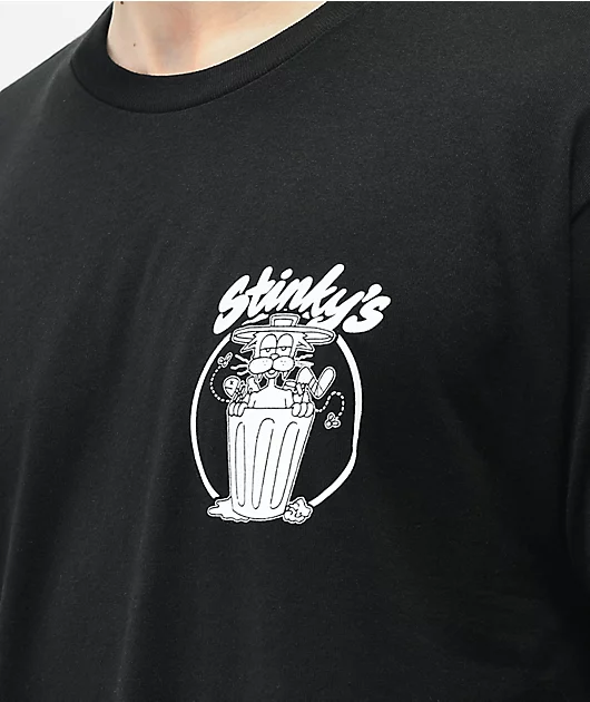 The Stinky’s A-Lab t-shirt is made from soft, breathable cotton and comes in a classic black colorway. This stylish and whimsical t-shirt boasts a graphic on the left chest and back advertising for a faux waste management company.