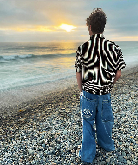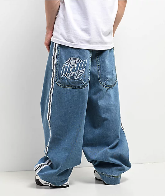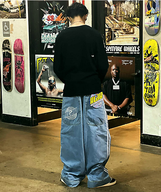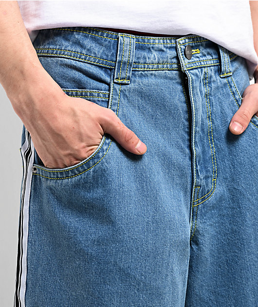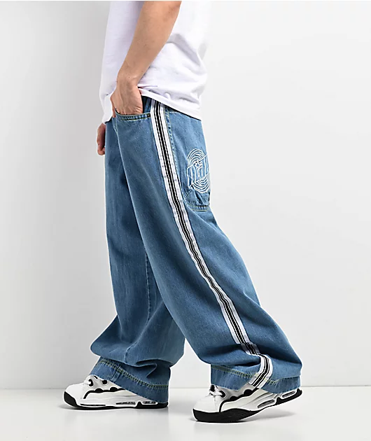 The blue color scheme of the Stripe Rave jeans from A.LAB has arrived in an oversized silhouette derivative of styles from the Y2K era.