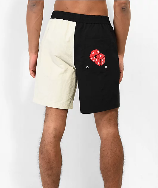 A.LAB brings the Taffy Cherry Dice board shorts in a black and white split colorway, showing a screen printed graphic of flaming cherries on the left thigh and dice on the right seat pocket. These board shorts have a mesh-lined interior for breathability,
