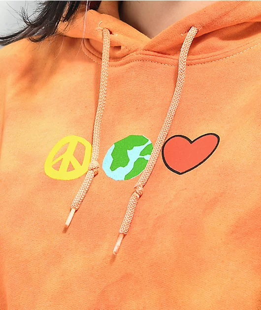 Spread the love with the Visualize Peace orange tie dye hoodie from A-Lab! This orange pullover features a custom dye treatment throughout, and is adorned by three screen-printed graphics of a peace sign, a heart, and the Earth at the chest of the hoodie,