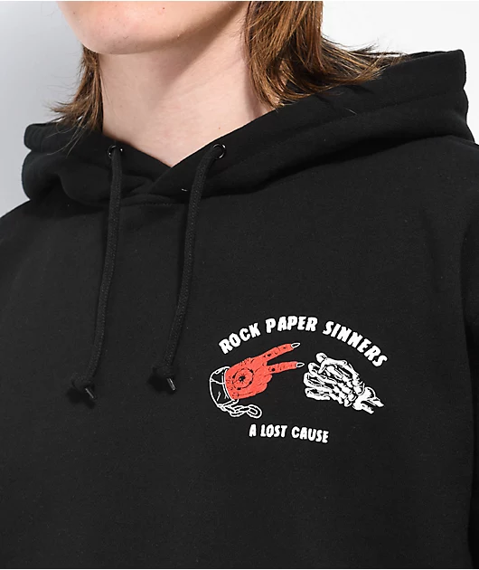 The Sinners hoodie from A Lost Cause comes in a black colorway with a screen-printed back graphic of a skeleton hand and a devil hand playing rock, paper, scissors under script reading, \”Rock paper sinners.\” For a comfortable fit, this hoodie has a drawst
