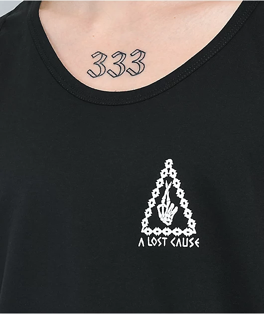 The Wishful A Lost Cause tank top is made from super soft, lightweight cotton and a versatile black colorway. This A Lost Cause tank top has a screen-printed graphic on the left chest and back of a skeleton hand crossing its fingers inside a chain triangl
