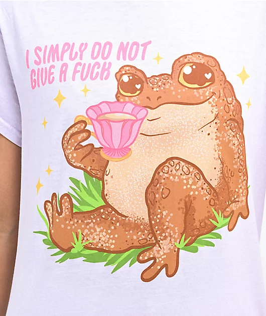 The I Simply DGAF t-shirt from A Ziggies is made of 100% cotton, boasting a screen-printed front graphic of a toad drinking out of a teacup, below script that reads, \”I simply do not give a fuck.\”