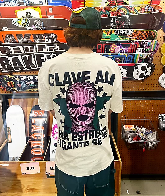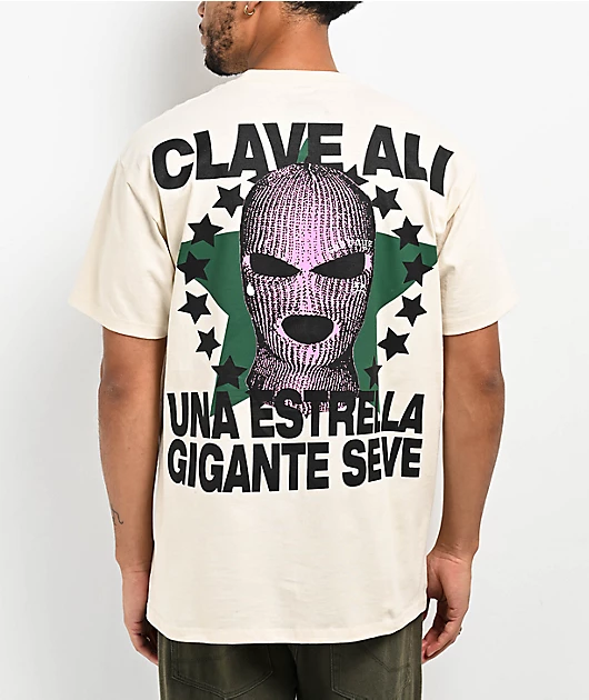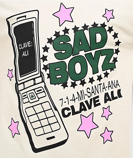 SAD BOYS by Junior H Clothing presents the Clave Ali t-shirt in a beige cream colorway and cotton construction, offering screen-printed graphics on the front and back with a streetwear look.