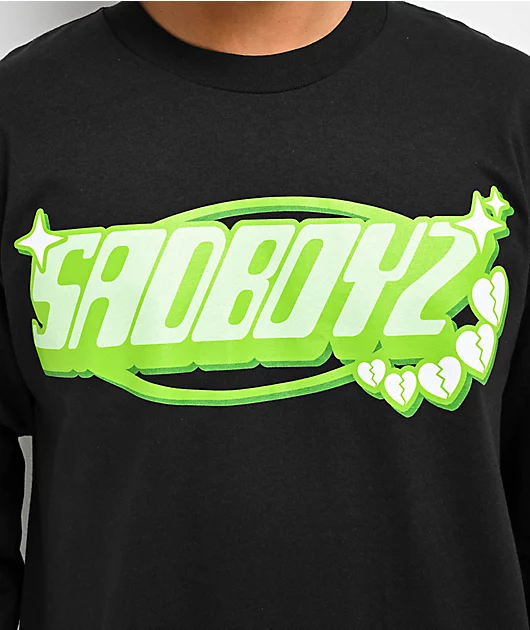 From SAD BOYZ by Junior H, the Puff t-shirt arrives in a long sleeve silhouette and black cotton build offering a screen-printed chest graphic of branding reminiscent of a popular cartoon in the early 2000s.