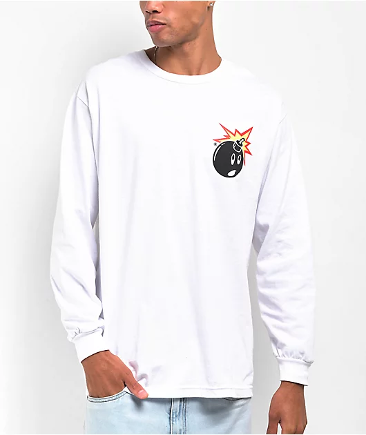Made of 100% cotton, this white, long sleeve t-shirt from Adam Bomb features the brand’s iconic bomb logo screen-printed on the left of chest and enlarged on the back so you can proudly rep your favorite streetwear brand.