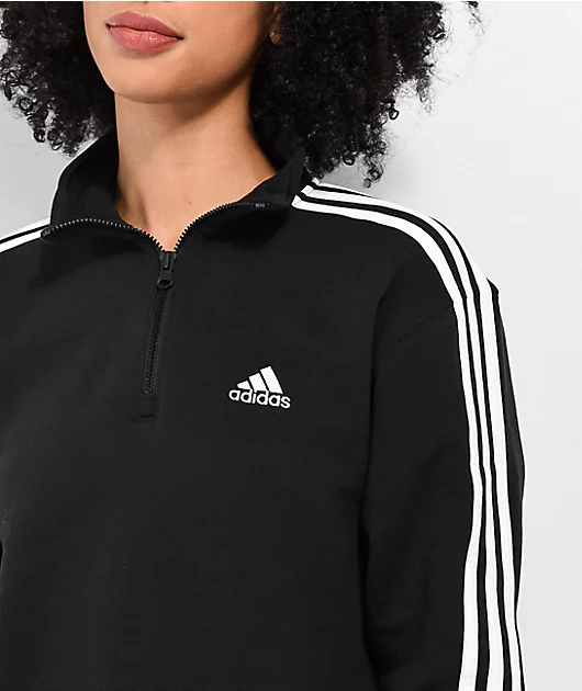 This sporty casual quarter zip sweatshirt from adidas comes in a black colorway with the iconic white stripes down the sleeves from the collar, as well as a white brand tag woven onto the left of chest.