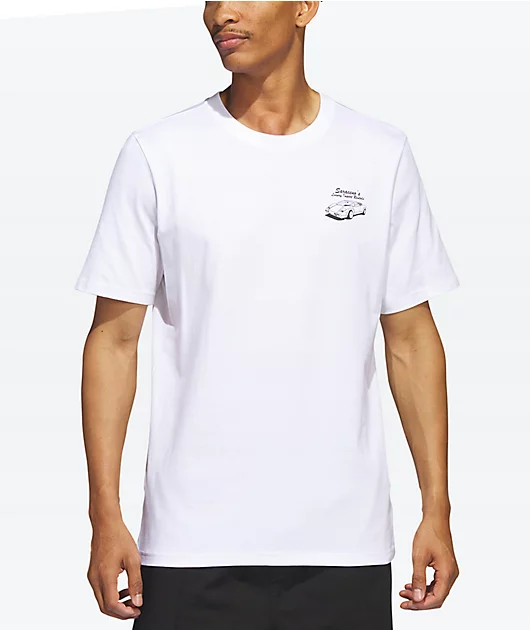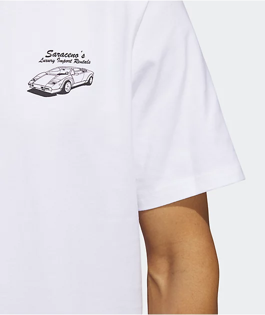 From adidas Originals’ Bootleg Business collection, the Zach’s Business t-shirt comes in a white colorway with graphics based on luxury car rentals. Team rider Zach Saracen’s passion for motorsports can be seen with imagery of retro sportscars printed on