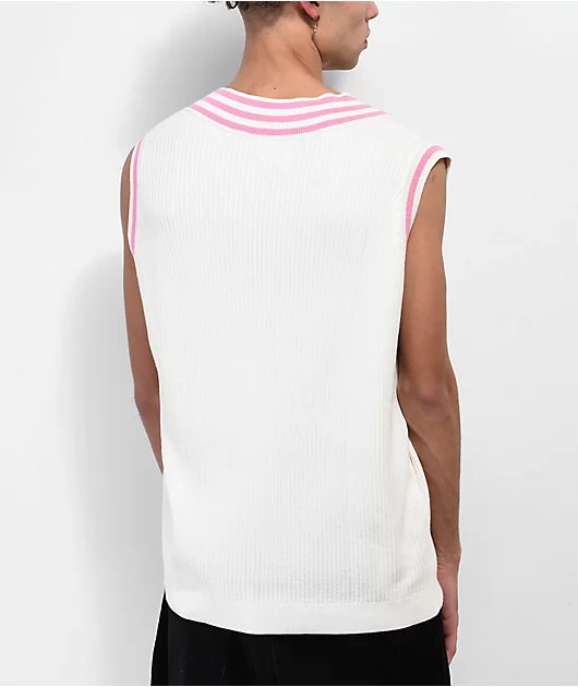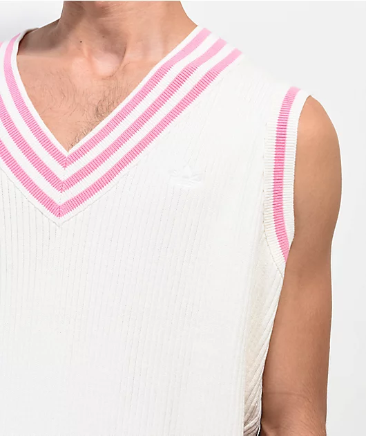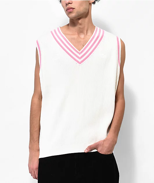 This white sweater vest from the official Adidas and Maxallure collaboration features pink stripes along the v-neck collar and arm openings for a preppy look. This ribbed sweater vest is perfect for layering while repping your favorite skate brands with t