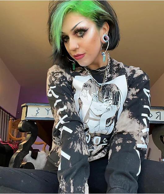 Make the most out of your morose moods with Animebae’s Sad Girl bleach black long sleeve t-shirt. The bleached black colorway lends some abstract patterning to the tee, while the slightly-cropped, unfinished hem and long-sleeved silhouette keeps it casual