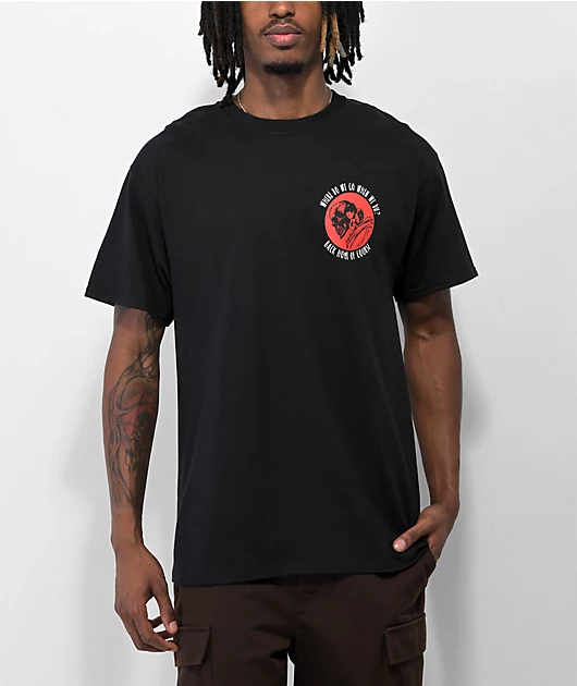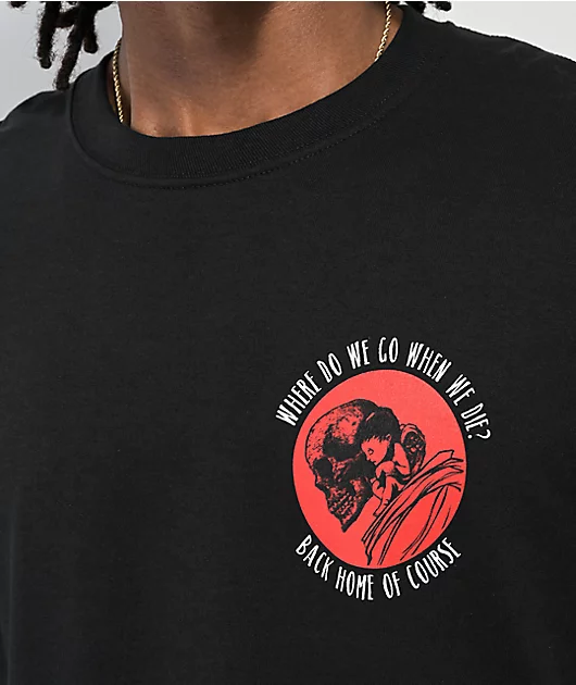 Made of 100% cotton, the Back Home t-shirt from Any Means Necessary comes in a black colorway with a screen-printed graphic on the left of chest, boasting a baby on the shoulders of a grim reaper figure, surrounded by script reading, \”Where do we go when