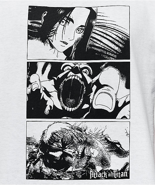 Catapult your tee collection with the Attack On The Titan Frames white t-shirt. This white tee features various black and white frames from Attack On The Titan, creating an eye-catching graphic tee.