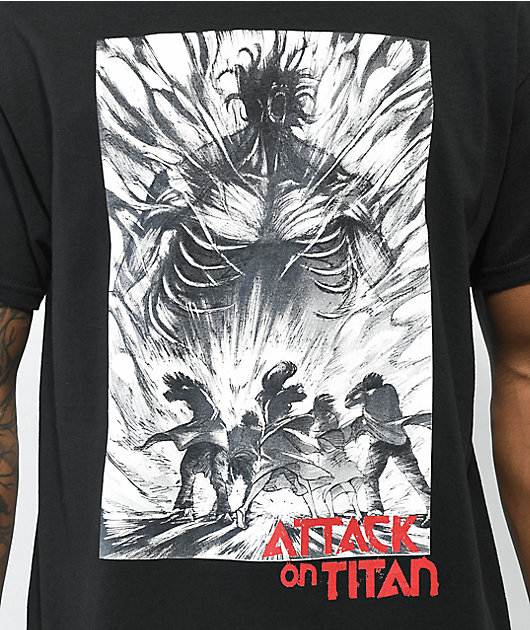 The Titan Powers t-shirt from Attack On Titan is made of 100% cotton and comes in a black colorway with a screen-printed graphic on the front of a crowd standing in front of a transforming titan.