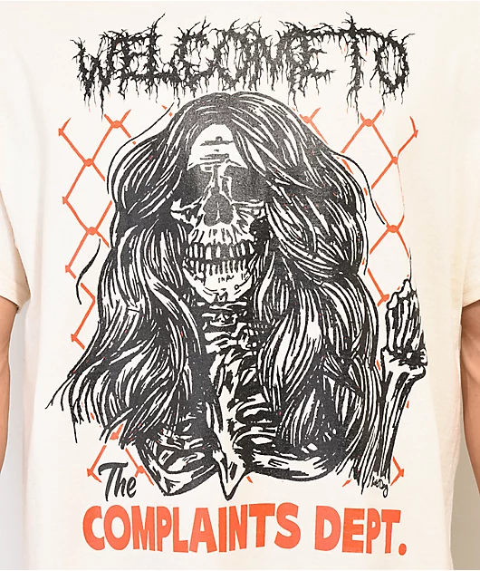 In a natural colorway comes the Complaints Dept t-shirt from Boss Dog. Displayed on the front is a graphic of a long haired skeleton flipping off the viewer with script above and below that reads, \”Welcome to the complaints dept.\” Red accents can be seen