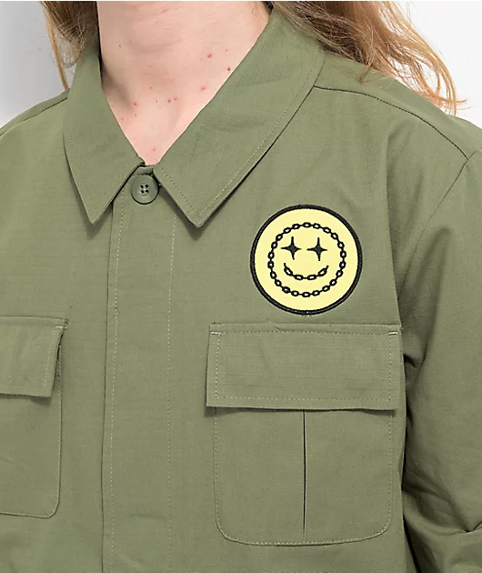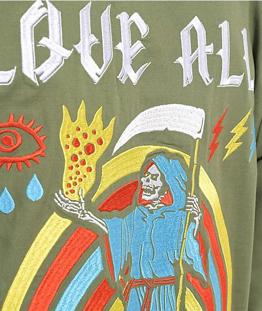 Boss Dog brings the Trust Few jacket in an olive colorway, showing off an embroidered patch of a smiling face left of chest. On the back is a colorful embroidery of a robed skeleton holding a scythe and standing before a rainbow, text above and below read